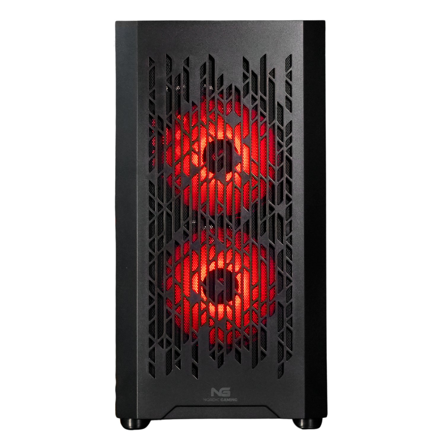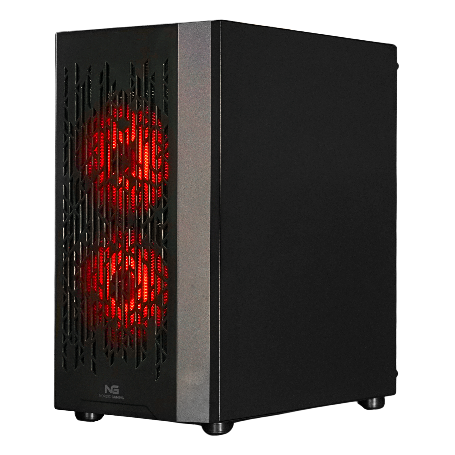 Gaming-PC'en er monteret i et Nordic Gaming Fenris kabinet, som sikrer effektiv køling og et stilrent design, der passer ind i ethvert gaming-setup.