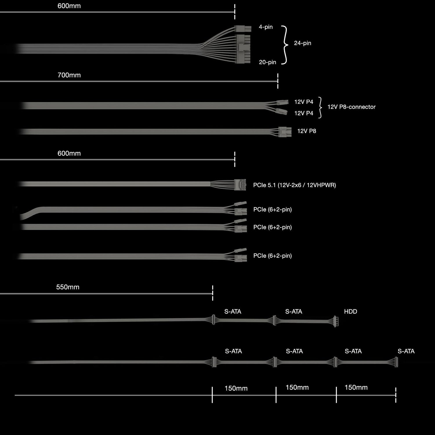 | Strømkabellængde SATA | 550,700,850,1000 mm |