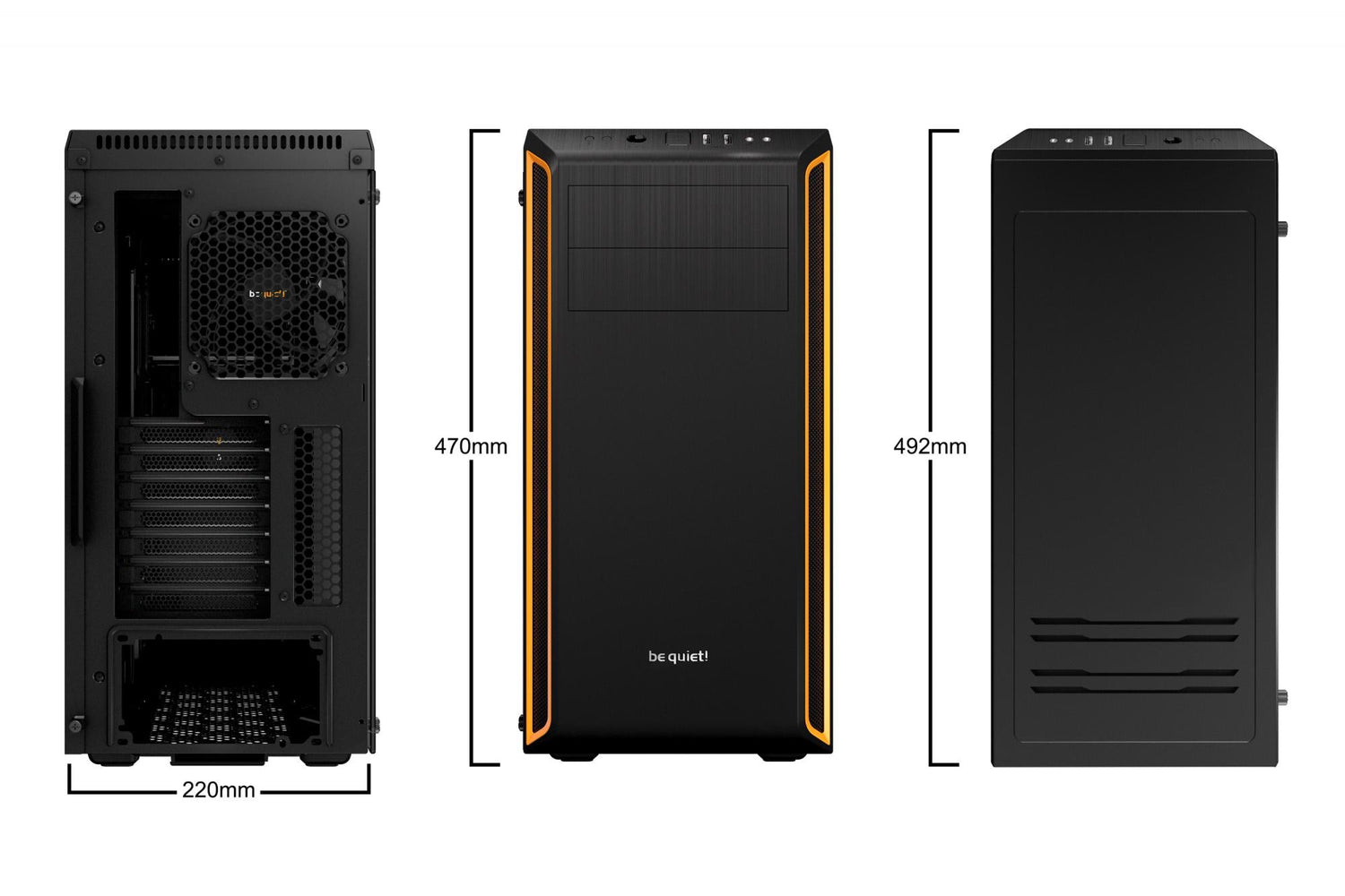 be quiet! Pure Base 600 Window. Formfaktor: Midi Tower, Type: PC, Produktfarve: Sort, Orange. Placering af strømforsyning: Bund, Understøttede strømforsyning formfaktorer: ATX. Frontventiler installeret: 1x 140 mm, Understøttede diametre for frontventilatorer: 120,140 mm, Bagerste ventilatorer installeret: 1x 120 mm. Understøttede HDD-størrelser: 2.5,3.5". Bredde: 220 mm, Dybde: 492 mm, Højde: 470 mm