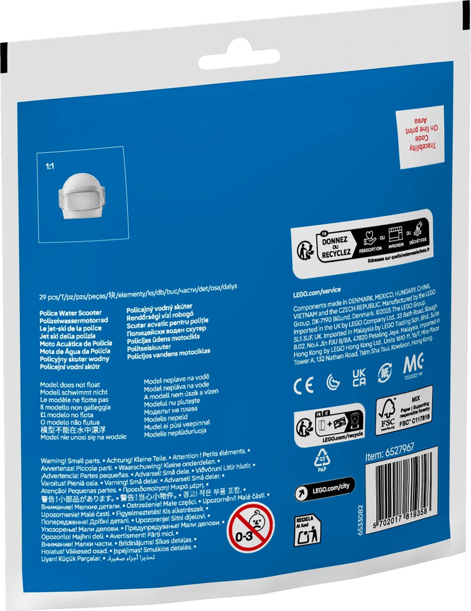 Der venter bølgeplaskende patruljeeventyr med LEGO® City sættet Politivandscooter, som indeholder en minifigur af en politibetjent med redningsvest, hjelm og håndjern.