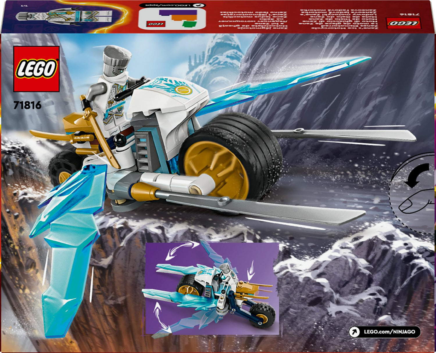 Med LEGO® NINJAGO® legetøjet Zanes ismotorcykel (71816) kan drenge og piger fra 7 år genskabe hæsblæsende action fra sæson 2 af tv-serien NINJAGO: Dragerne vågner. Ninjalegetøjet til børn indeholder en NINJAGO-motorcykel med bevægelige hjul, gyldne klinger og affjedring på bagdækket. Når børn trykker ned på dækket, foldes seje isklinger ud på begge sider i angrebstilstand.