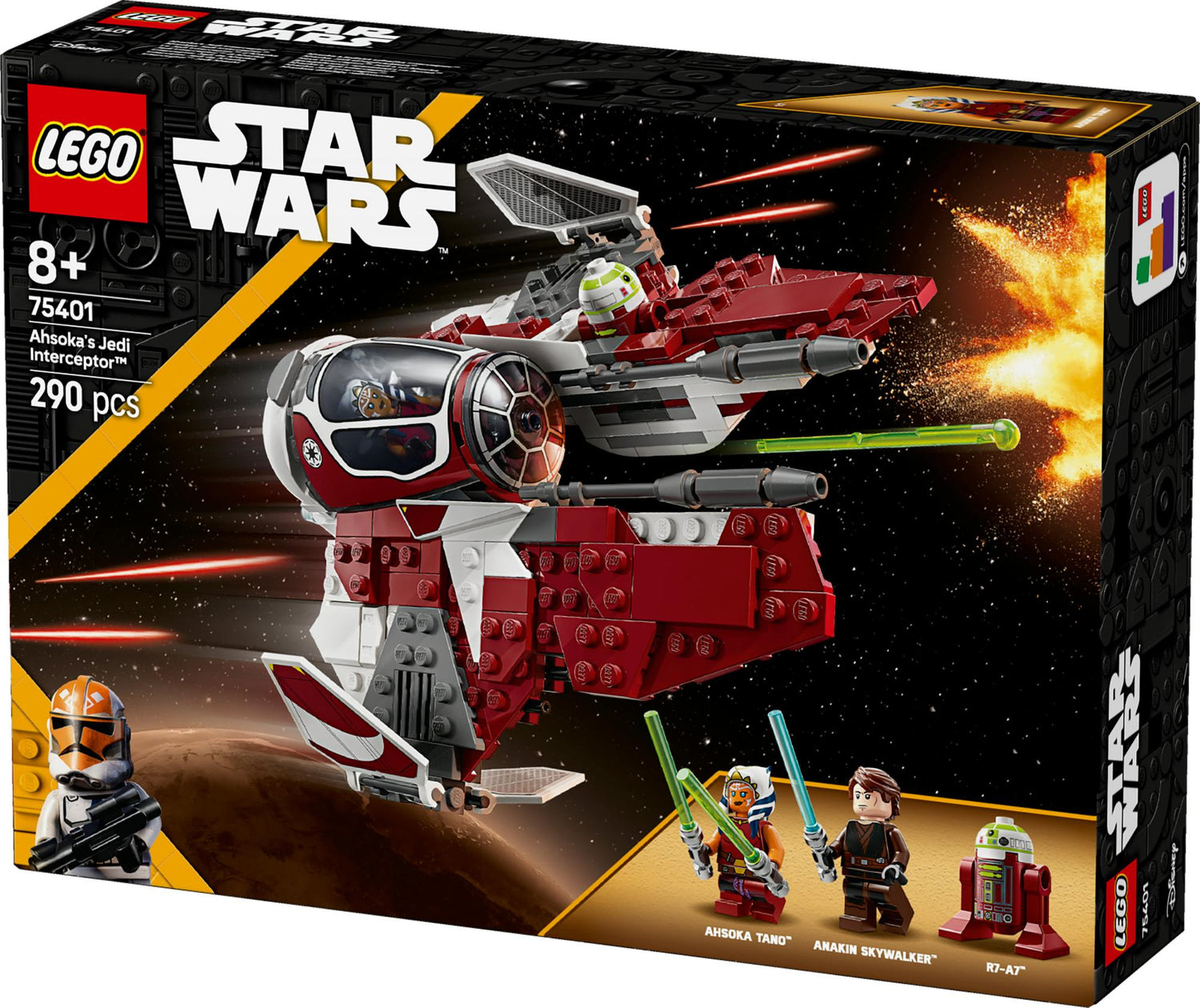 Lad børn skabe deres egen spændende eventyr fra Star Wars: The Clone Wars™ med stjernejager-byggelegetøjet Ahsokas Jedi Interceptor (75401). Den klodsbyggede LEGO® Star Wars™ jedi-interceptor er en sej gaveidé til drenge, piger og fans fra 8 år og har cockpit, der kan åbnes, vinger, der kan justeres til angrebs- og cruisetilstand, samt 2 fjederbetjente skydere. Bygge- og legesættet indeholder 2 LEGO Star Wars minifigurer – Ahsoka Tano og Anakin Skywalker med lyssværd – samt en LEGO droidefigur af R7-A7 til fantasifuld leg. Ahsoka kan anbringes i jedi-interceptorens cockpit, og der er plads ombord til R7-A7 og opbevaringsplads til Ahsokas lyssværd.