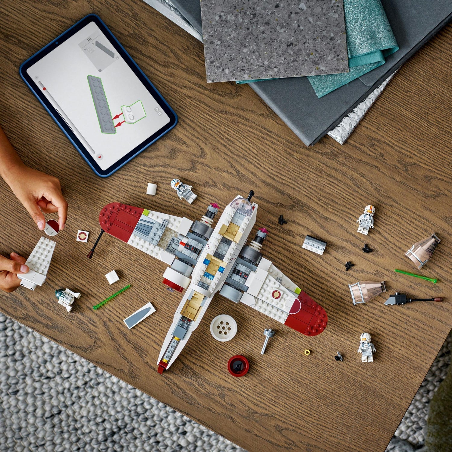 Gør børns kreative oplevelse endnu bedre med LEGO Builder appen, hvor de kan zoome ind på og dreje en digital 3D-version af Star Wars stjernejageren, mens de bygger.