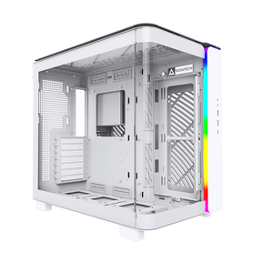 Dette Miditower-kabinet fra Montech KING Series kombinerer robust SPCC-stål med elegant hærdet glas i et design, der giver maksimal fleksibilitet. De forudinstallerede ARGB PWM blæsere giver dig perfekt belysning lige fra start, mens det buede glas skaber et sofistikeret, diffust RGB-glow.