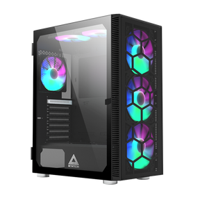 - • 6 RGB LED fans inkluderet: 3x 140 mm front + 1x 120 mm bag + 2x 120 mm top – spar hundredvis af kroner!