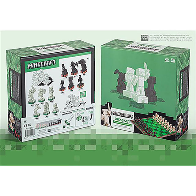 Dit sæt indeholder ikke blot standard skakfigurer, men alle dine yndlingskarakterer: Steve, Alex, Ender Dragon, Wither, Golems og andre Overworld Heroes og Hostile Mobs. Brættet på 46 x 46 cm har en ramme med træ-look og tekstureret græs i nuancer af grøn spilflade, der bringer Minecraft-atmosfæren direkte til dit bord.