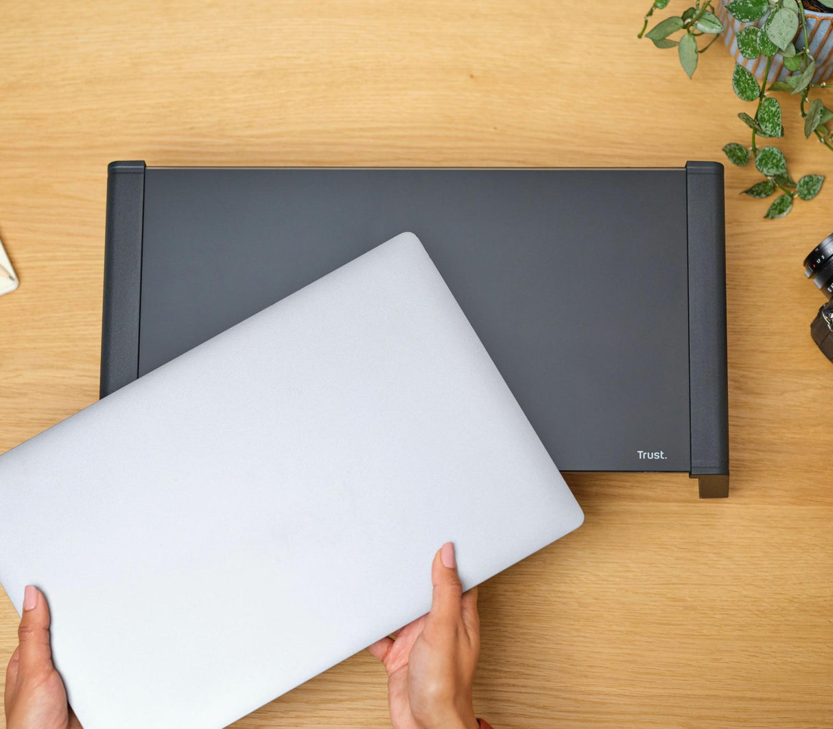 Gør dit arbejdsområde mere ergonomisk, ryddeligt og stilfuldt med Trust Monta Glass Monitor Stand – den perfekte kombination af funktionalitet og design! 💻🖥️✨